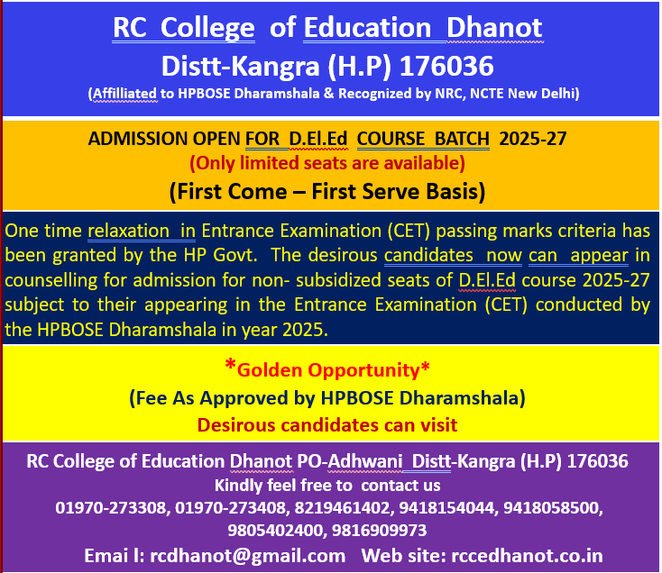 R.C. College of Education, Dhanot, P.O. Adhwani, Teh. Jawalamukhi Distt. Kangra (H.P.) has come into existence with the efforts of R. C. Shiksha Samiti Dhanot and the courtesy of Himachal Pradesh Govt., H.P. University Shimla, NCTE Jaipur and H.P. Board of School Education Dharamshala. This College is one of the oldest B.Ed. College in the area (successfully completed 8 sessions). The College introduced Teaching of B.Ed. Course in the year 2003 - 2004 with an annual intake of 60 students in B.Ed. in all the three streams (Medical, Non - Medical and Arts/Commerce).