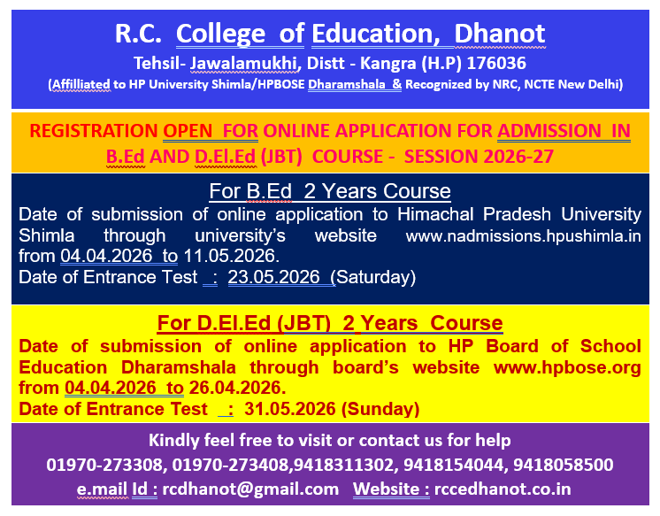 R.C. College of Education, Dhanot, P.O. Adhwani, Teh. Jawalamukhi Distt. Kangra (H.P.) has come into existence with the efforts of R. C. Shiksha Samiti Dhanot and the courtesy of Himachal Pradesh Govt., H.P. University Shimla, NCTE Jaipur and H.P. Board of School Education Dharamshala. This College is one of the oldest B.Ed. College in the area (successfully completed 8 sessions). The College introduced Teaching of B.Ed. Course in the year 2003 - 2004 with an annual intake of 60 students in B.Ed. in all the three streams (Medical, Non - Medical and Arts/Commerce).